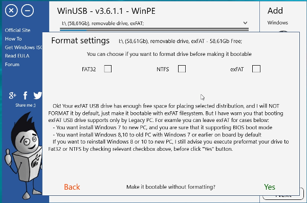 Приложение выведет предупреждение, что созданный съемный накопитель вида exFAT не сможет функционировать в системах других типов.